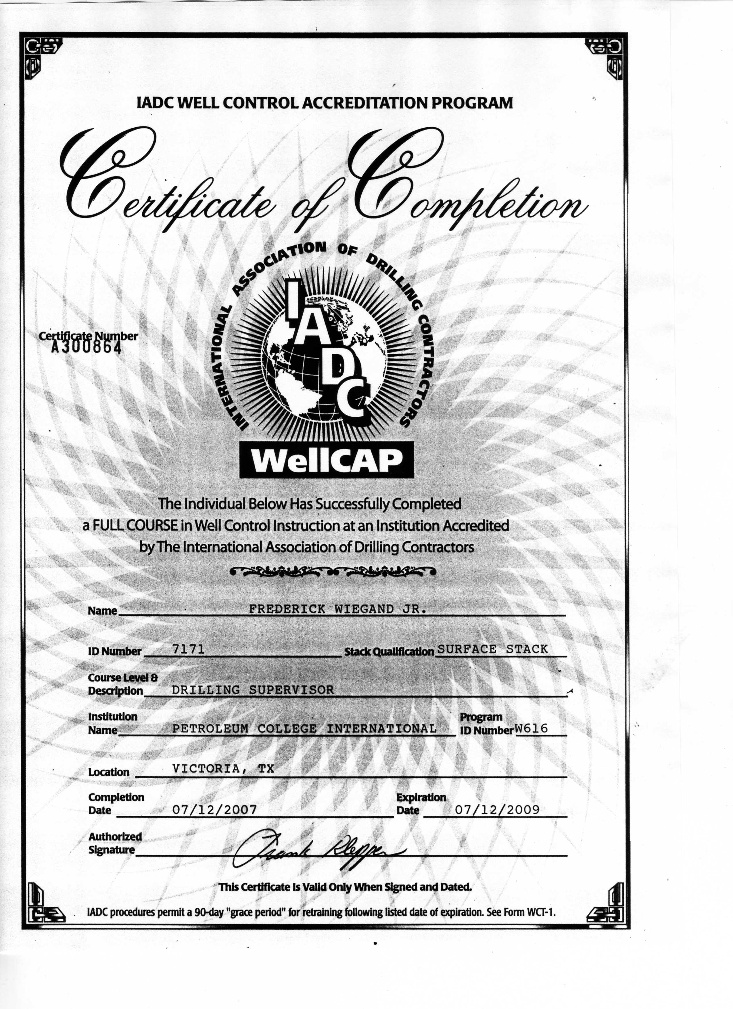 Control Certificate Supervisor Level, Surface and Subsea, IADC WellCap valid for 2 years.